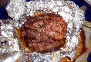 egy alumínium fóliára teszünk 3-4 babérlevelet,egy fél gerezd fokhagymát apróra vágva, valamint egy fél hagymát karikára vágva rátesszük a hústa tetejére ugyanazt tesszük, amit az aljára (3-4 babérlevelet, egy fél gerezd fokhagymát, apróra vágva, valamint egy fél hagymát karikára vágva),a fóliába jól becsombolygatjuk (még egy rend fóliát rakunk rá), majd hűtőbe tesszük másnapig, de legalább 2-3 órára.